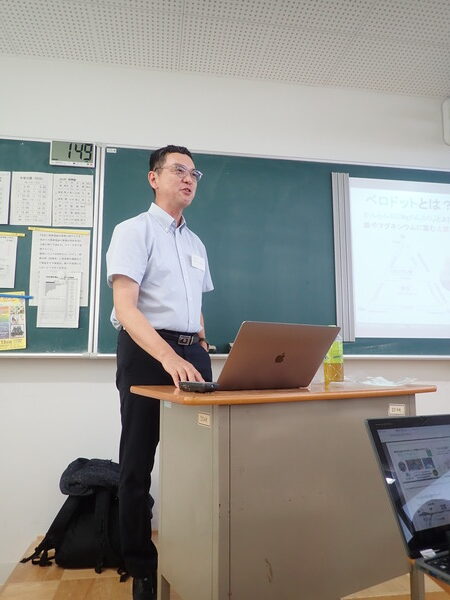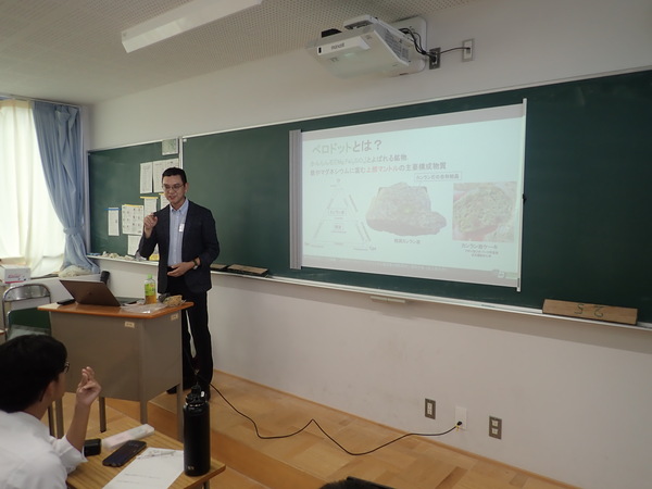 鉱物の見本をみせながらマントルの構造や海洋プレートの説明、更に海洋調査の意義についての興味深い講義となりました。また、2022年にご自身が体験された水深9800m(日本人最深潜航記録)の世界についても貴重な写真を示しながらお話をしていただき参加した生徒も感銘を受けていました。