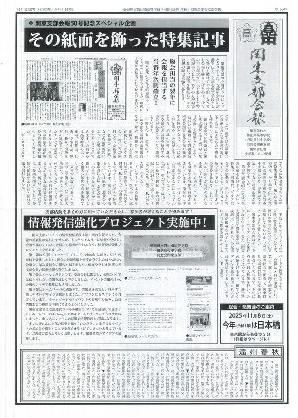 関東支部は9月、2025年の会報を発行しました。関東支部の会報は昭和50年(1975年)に創刊され、ついに50号となりました。支部や会員の活動を伝え、交流を促す手段として発行を続けて半世紀。今年は50号記念のスペシャル企画を掲載しました。