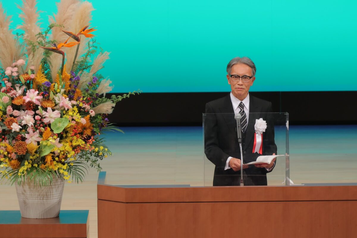 花福による演壇の装飾花 右は式辞を述べる野村校長(2022年11月11日:かたりあ)
